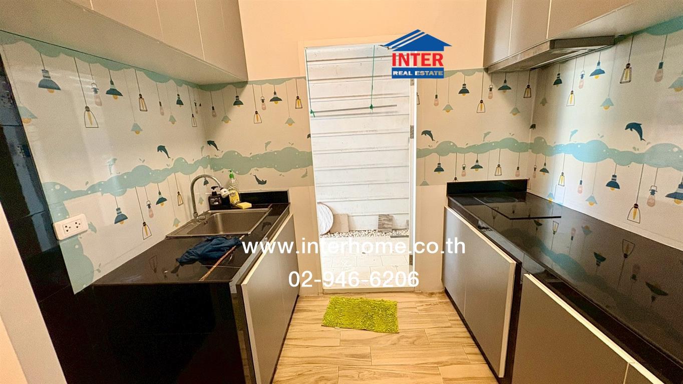 • มี 1 ห้องครัว กั้นด้วยกระจก พร้อมบิวท์อินชั้นวางของ พร้อมด้วยเตาไฟฟ้า ต่อเติมครัวเต็มพื้นที่