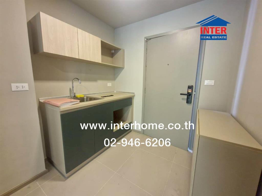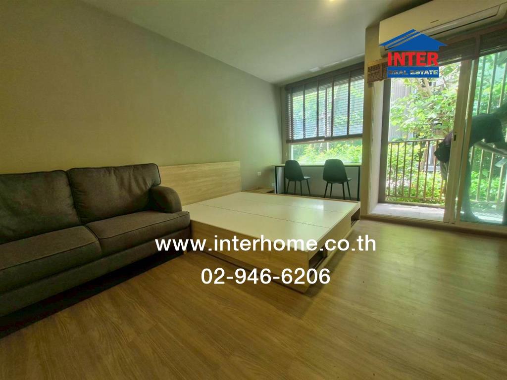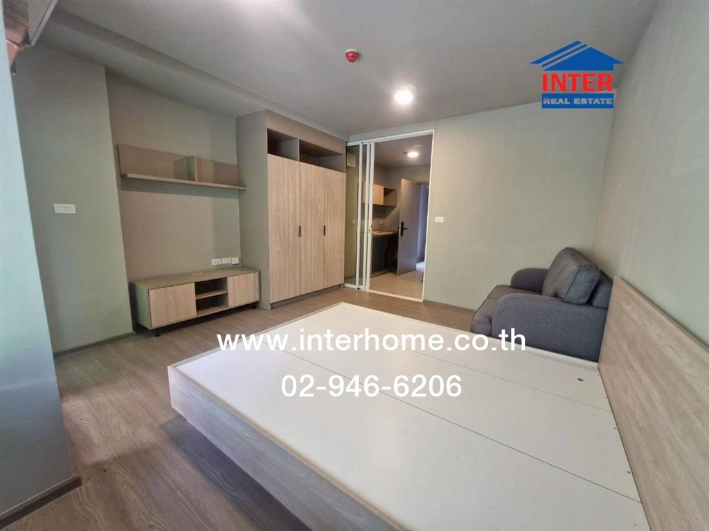 • พื้นปูลามิเนต ตกแต่งพร้อมอยู่ มีเตียง ตู้เสื้อผ้า ชั้นวางทีวี ชั้นเก็บรองเท้า บิวท์อินครัว